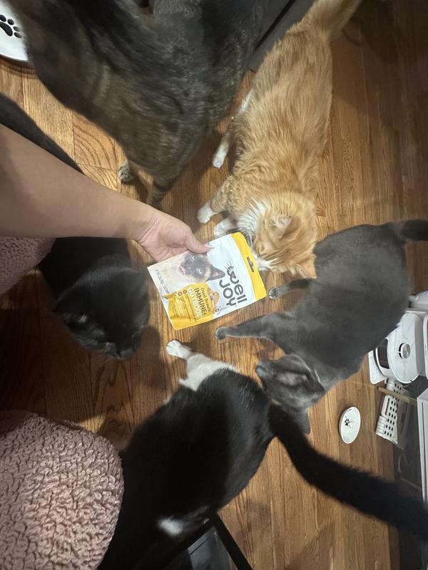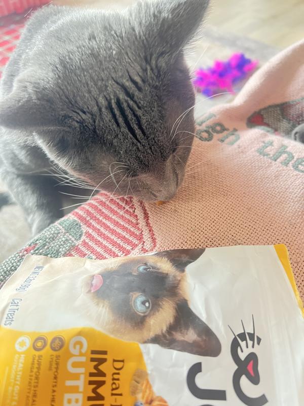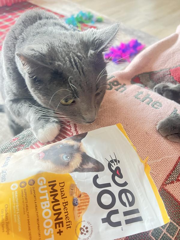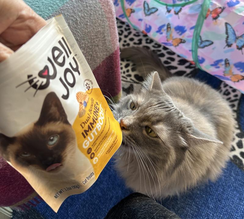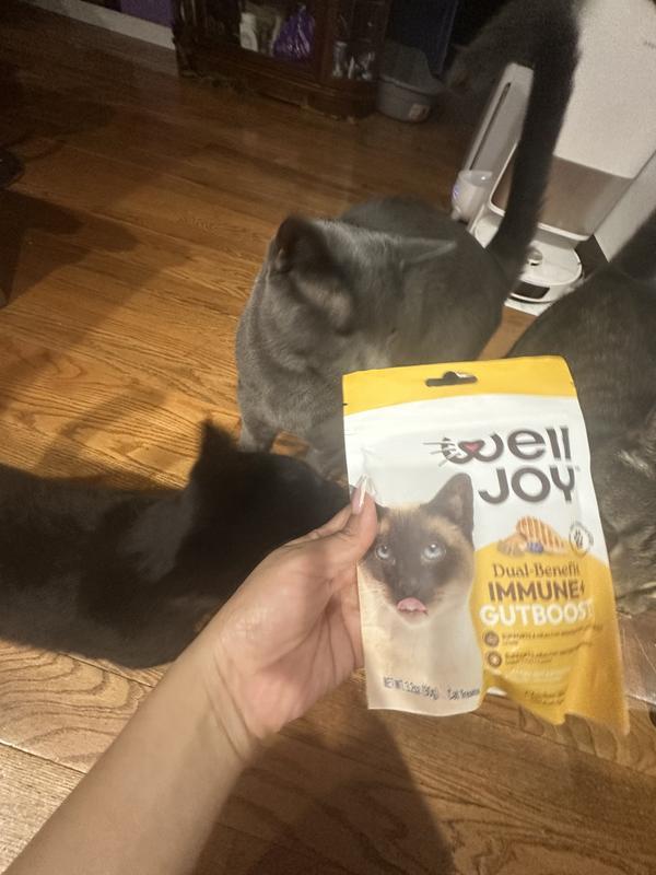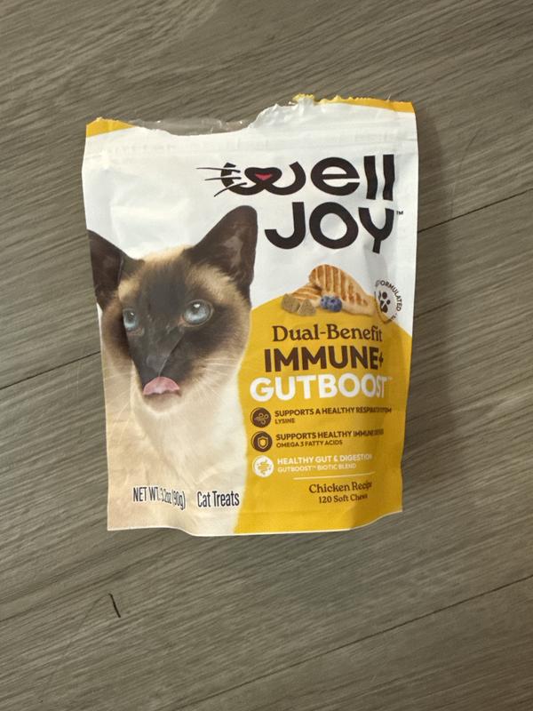 Well joy Dual benefit, gut boost, soft chews, were a pleasant surprise! My three-year-old cat is on a fiber, prescription food and has teary eyes. He is one of four cats, and I offered these chews to each of my cats I was ecstatic when Lucius, my cat with the health issues like these treats! He gobbled them up right away. I am really hoping that this can be a regular item that I can give him to see if it will help with his stools and if it will help with his runny eyes