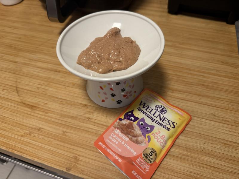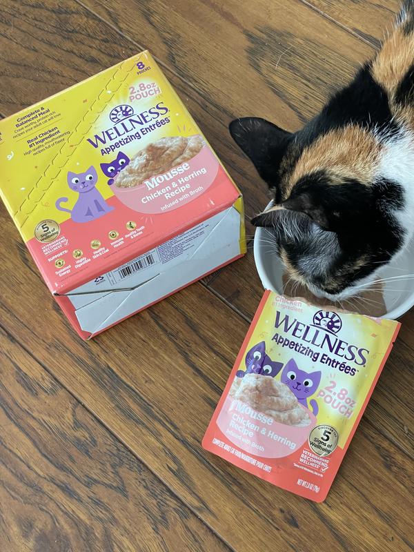 - Wellness Appetizing Entrees Infused Chicken Broth Natural Grain-Free Mousse Wet Cat Food, 1.4-oz pouch, case of 8$9.52 Chewy Price$9.04 Autoship PricePromo, New Customers Only: Spend $49+, Get $20 eGift Card