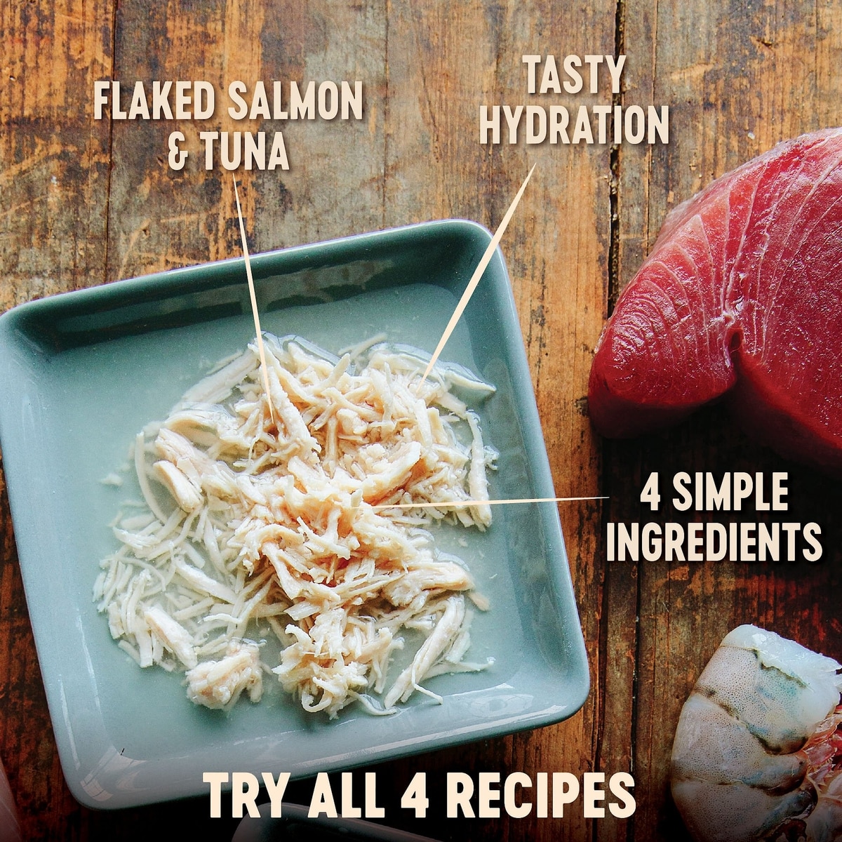 - Provides a boost of pure protein and hydration with just four ingredients—flaked wild salmon, tuna, fish broth, and water.