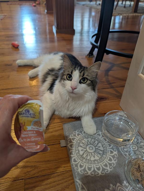 - Wellness Complete Health Healthy Indulgence Morsels with Salmon & Tuna in Savory Sauce Grain-Free Wet Cat Food Pouches, 3-oz, case of 24$47.76 Chewy Price$45.37 Autoship PricePromo, New Customers Only: Spend $49+, Get $20 eGift Card