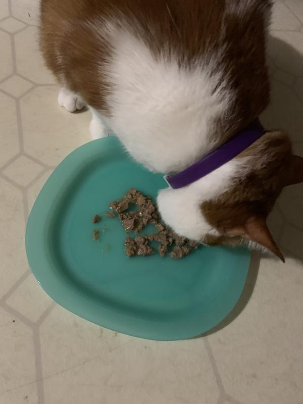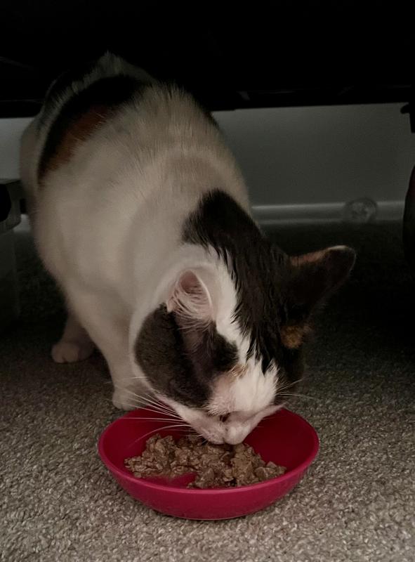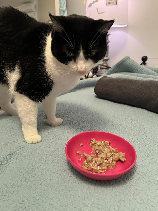 This wet cat food is awesome! All four of my cats are huge fans. What I really appreciate is the design that allows me to easily split it into half portions. Plus, the fact that I can just serve it right in the container is a game-changer—no extra dishes to scrub! It makes feeding time so much cleaner and faster. I can't recommend this enough! Just a little treat for my feline friends. :)