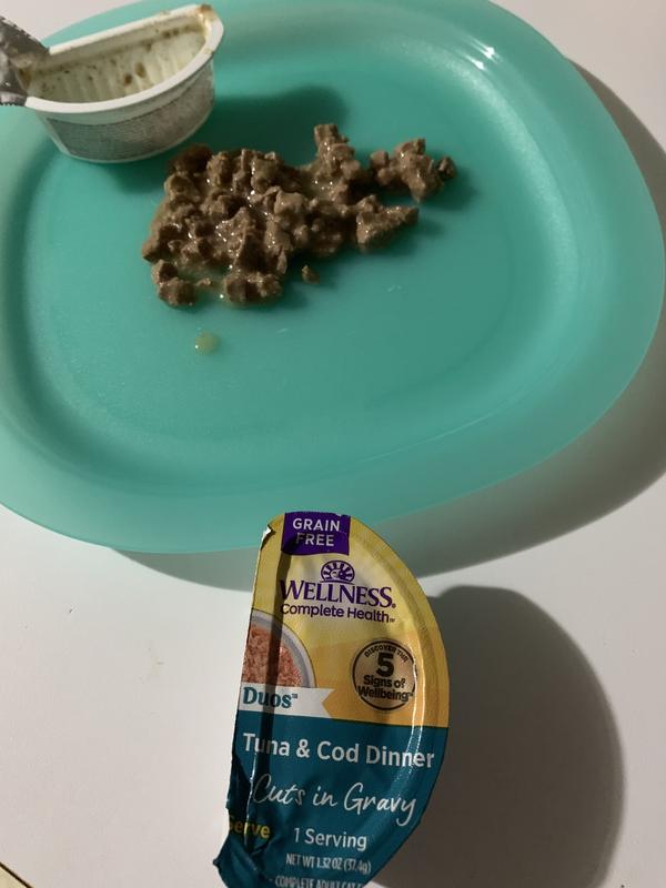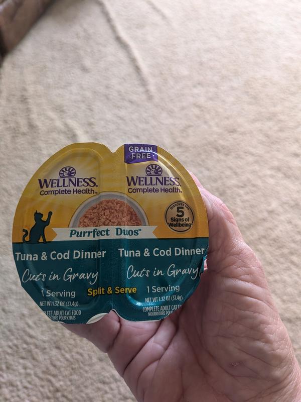 I like the Wellness Complete Health Purrfect cat food packaging since it has the two separate packs that are a good size for each of my two cats. They both are older and enjoy the gravy that the tuna & cod had. The cuts of tuna & cod cuts were not really something they were good with. They are used to pate foods and the cuts are a little tougher for them to chew so neither of them finished off their meals. If your cats enjoy food that has cuts in in then they will probably enjoy this product.