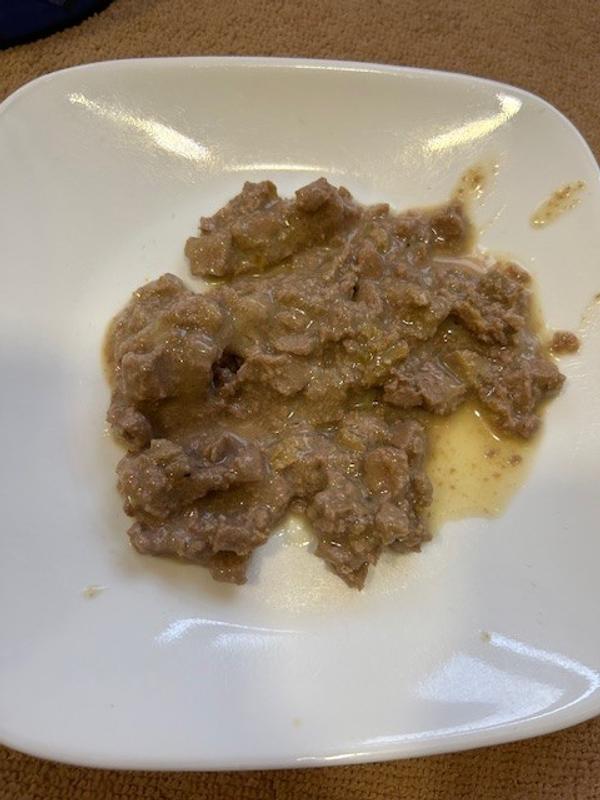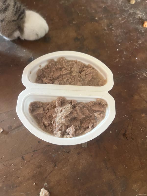 Both my cats loved this food -cuts in gravy. Grain free and with just the right amount of gravy - not too soupy. They are used to getting pate food and this formula was an instant hit ! Each packet is divided into 2 equal portions which are perfectly sized - one for each of my two cats per meal since the also have free access to dry food. . The packaging however isn’t ideal in my estimation. Foil tabs are hard to open ,rippled hard plastic interior leaves food behind ( although my dog appreciates being able to thoroughly ‘clean it out’ for me), and not really sure if that plastic container is recyclable. Aluminum or metal cans are certainly more sustainable.