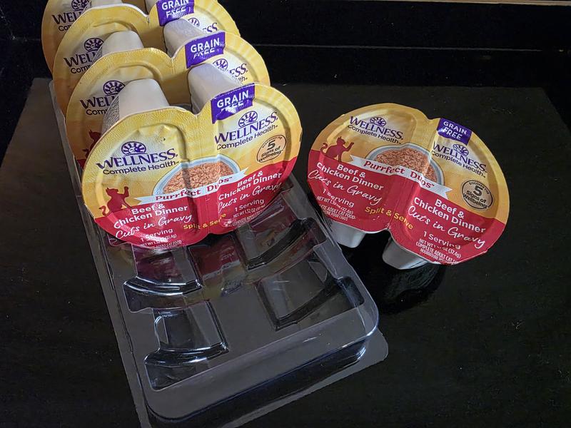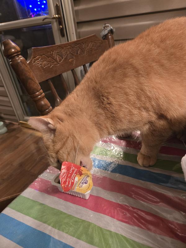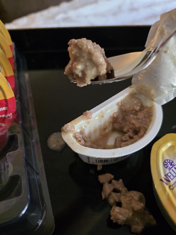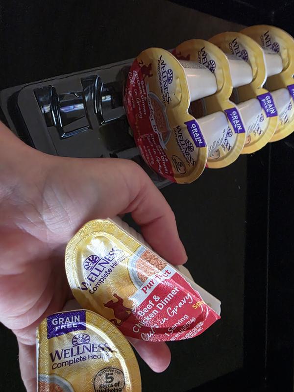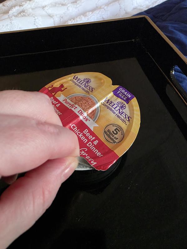My 15 year old cat will eat these flavors of Wellness foods from cans or pouches but she wouldn't even touch them from these plastic cups. I liked the handy size of these but I had to return them since she absolutely refused them.