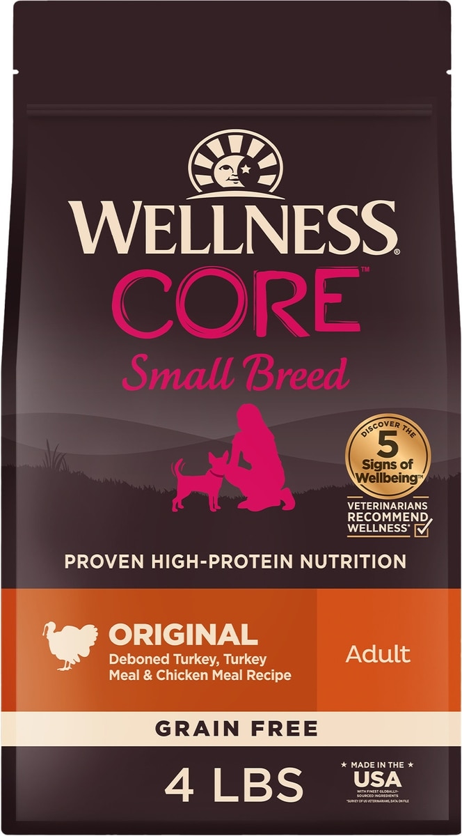 - Wellness CORE Grain-Free Small Breed Healthy Weight Deboned Turkey Recipe Dry Dog Food, 4-lb bag$20.98 Chewy Price$21.99 List Price$19.93 Autoship PricePromo, New Customers Only: Spend $49+, Get $20 eGift Card +2 deals