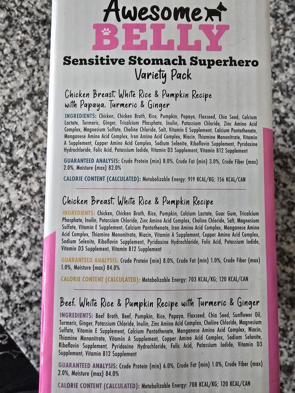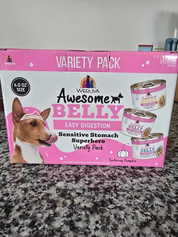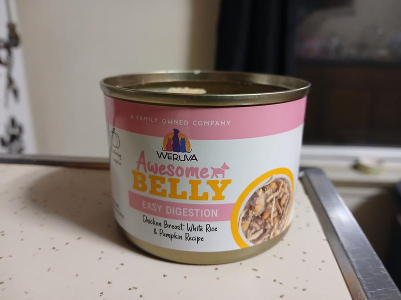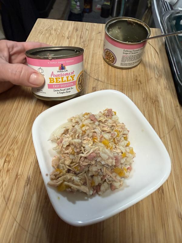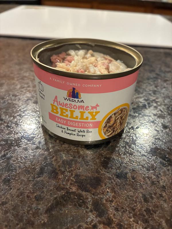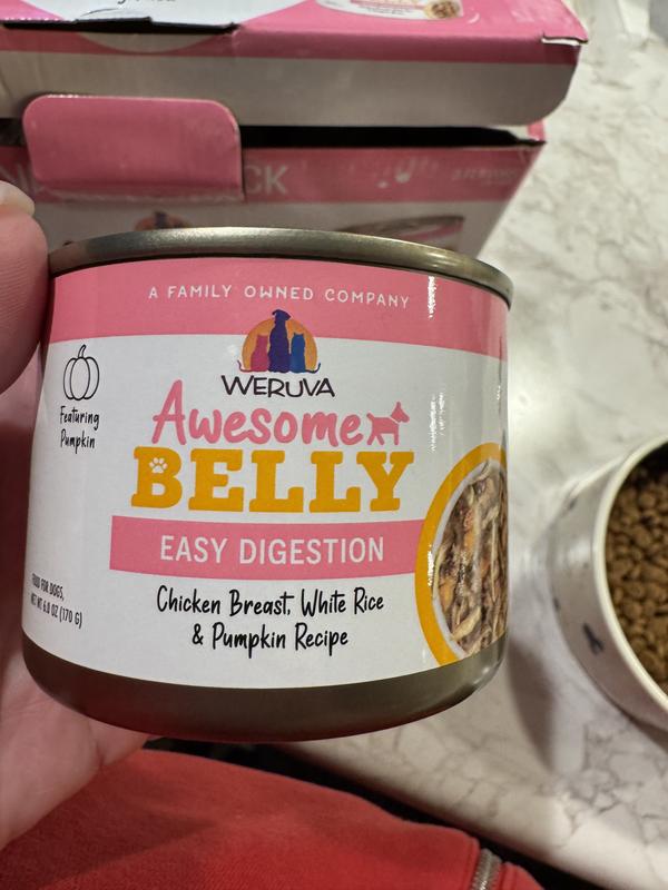 - DealWeruva Awesome Belly, Chicken Breast, White Rice & Pumpkin Recipe Adult Gluten-Free Shredded Canned Wet Dog Food, 6-oz can, case of 8$26.32 Chewy Price$25.00 Autoship PricePromo, Spend $100, Get $30 eGift Card with code NEWYEAR +1 deal