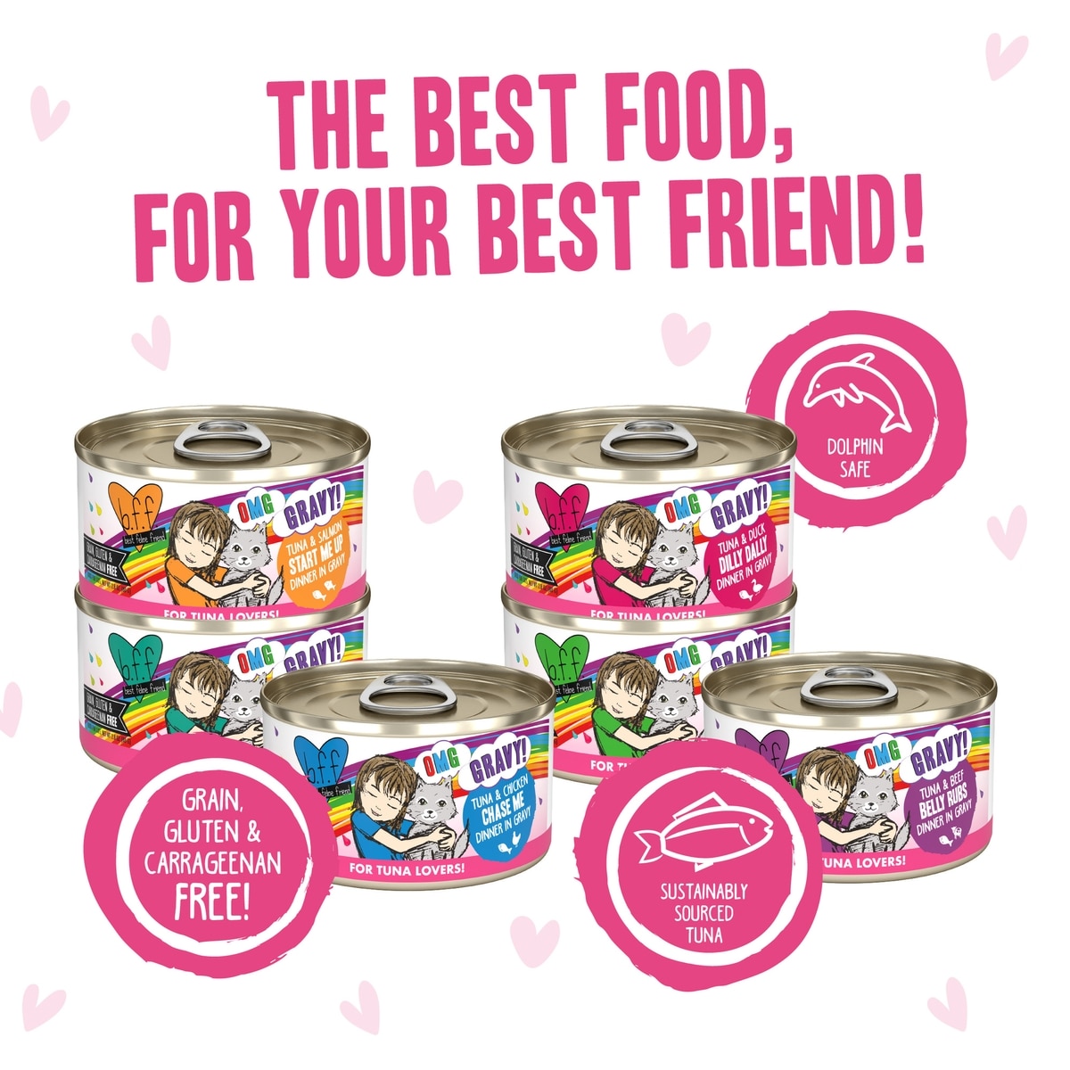 B.F.F. OMG Gravy recipes feature tender red meat tuna (wild-caught and dolphin-safe), wild-caught tilapia, boneless skinless chicken, or pumpkin. Made with no artificial flavors, preservatives, or colors, B.F.F OMG recipes are all-natural, grain-free, gluten-free, and carrageenan-free.