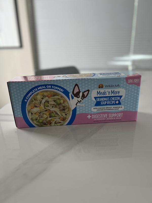 I have been feeding my dog Weruva Meals 'n More Natural Wet Dog Food, Grandma's Chicken Soup Plus Digestive Support for several months now and he loves it! He has a sensitive stomach, and this food has helped to improve his digestion and overall health. He is also more energetic and playful since I started feeding him this food. Gifted by weruva