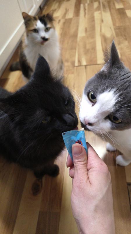 All 3 of my cats were very excited about these Puddy Pop treats from Weruva! In fact, as I'd be giving one of them some of the packet, the others would come over