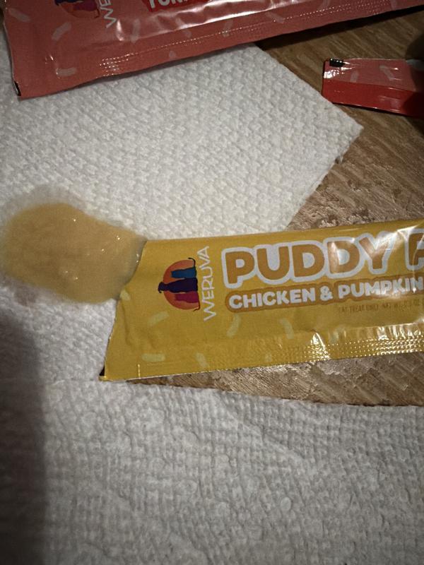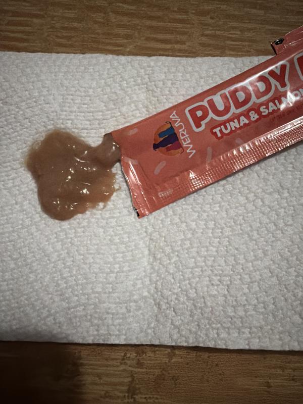My cats loved all 3 flavors of Puddy Pops. My youngest cat knew what the container was and would come running anytime he saw me with it. My cats don’t like the idea of licking treats from the package, so I put it in a bowl and they lick the bowl clean. The packages contained more product and were much easier to open than other similar products. There were only 2 packages in the entire container of 50 that didn’t tear open well enough and I needed to use scissors. The texture of the treat is good…soft but not runny. Overall great product that I would use again.