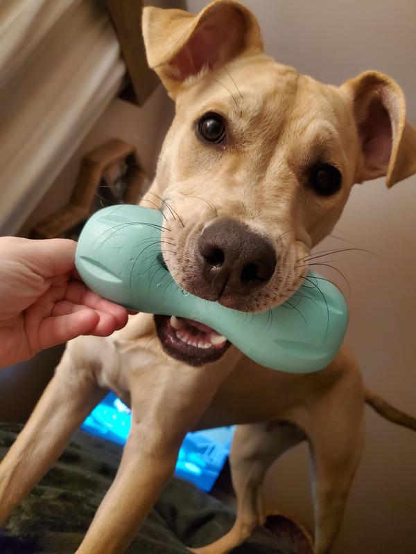 This treat toy is a staple in our house! We always have one and it last for months. It is a great for option for tough chewers and allows you to put treats, peanut butter, etc in the middle for food motivated pups like mine. West Paw makes great products!