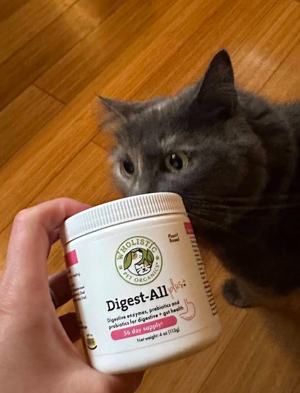 Wholistic Pet Organics Digest-All Plus Dog & Cat Supplement is made from pure plant based enzymes and pre and pro biotics. There is nothing added, no grain or fillers.
