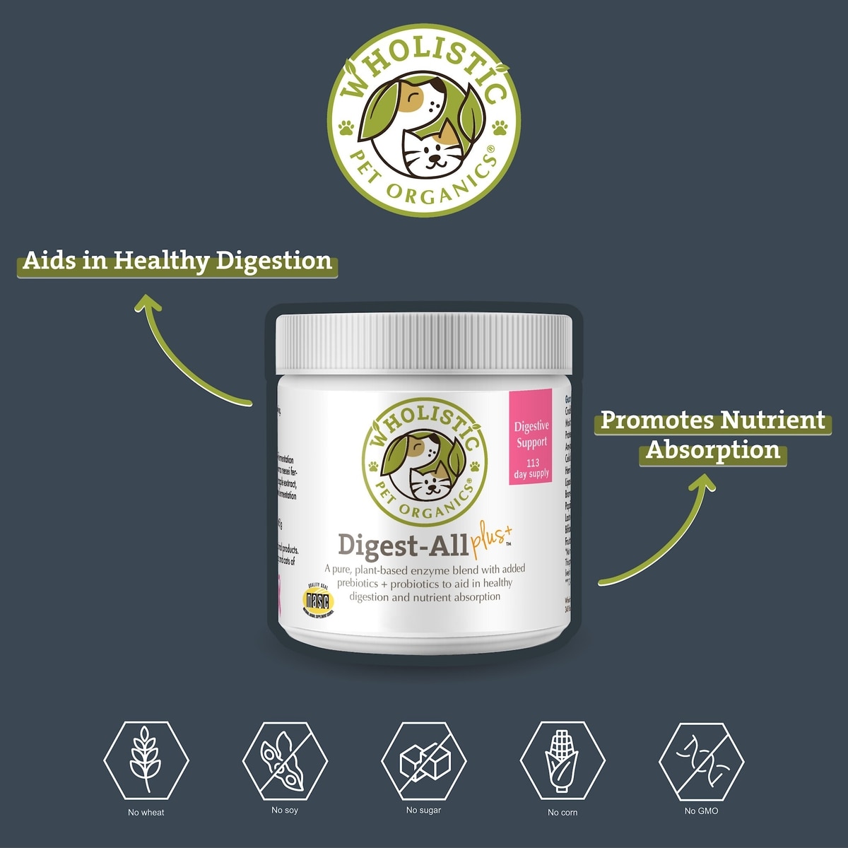 Wholistic Pet Organics Digest-All Plus Dog & Cat Supplement is made from pure plant based enzymes and pre and pro biotics. There is nothing added, no grain or fillers.