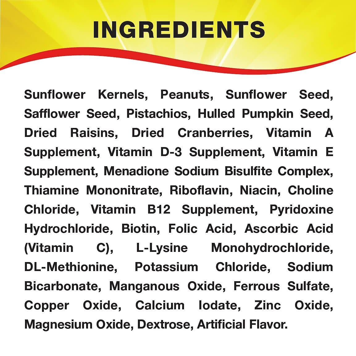 This bird food is formulated to attract songbirds, woodpeckers, cardinals, finches, titmice, jays, grosbeaks, buntings, nuthatches, chickadees and other outdoor pets.