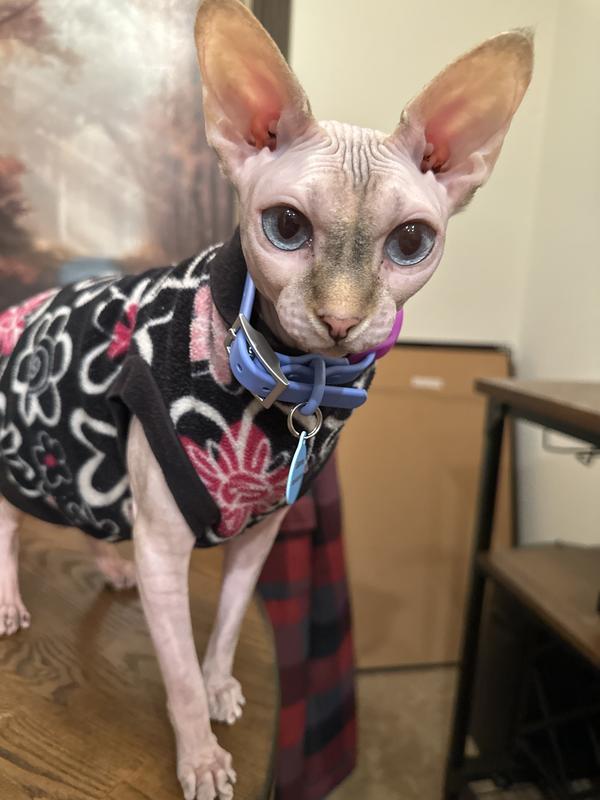 This collar is exactly what I needed for my 2 Sphynx girls! I was looking for something soft, lightweight, easy to clean, resistant to staining, durable, and no