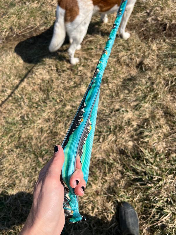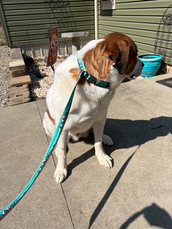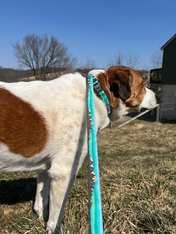 My dog and I have really enjoyed this leash; the double handles (one closer to the collar for heeling and more security) and the one further up to the clasp are super nice and convenient. The leash is beautiful in design, very durable, has a strong clasp at the end, and is easy to wash and clean off. The built in collar is very secure and adjusts size really easily; it fits my large saint bernard-mix dog very well. The only downside in my opinion is the length of the leash - it is super long, which is nice, but I find it slightly unsafe when using it hands-free; unless your dog is trained or enjoys running/walking far ahead of you, I think it is a bit unsafe. But otherwise, I would recommend this leash to any constant runners or adventurers with dogs!