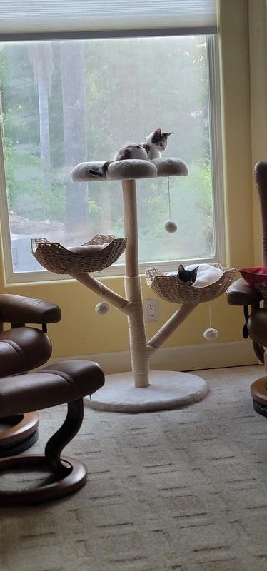I wanted this to work for my cat so bad, but she refuses to sit on it. The top flower wobbles even though it is tightly screwed, and the pillows for the two woven baskets are not stuffed for much support.