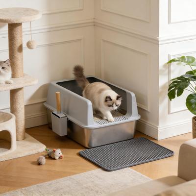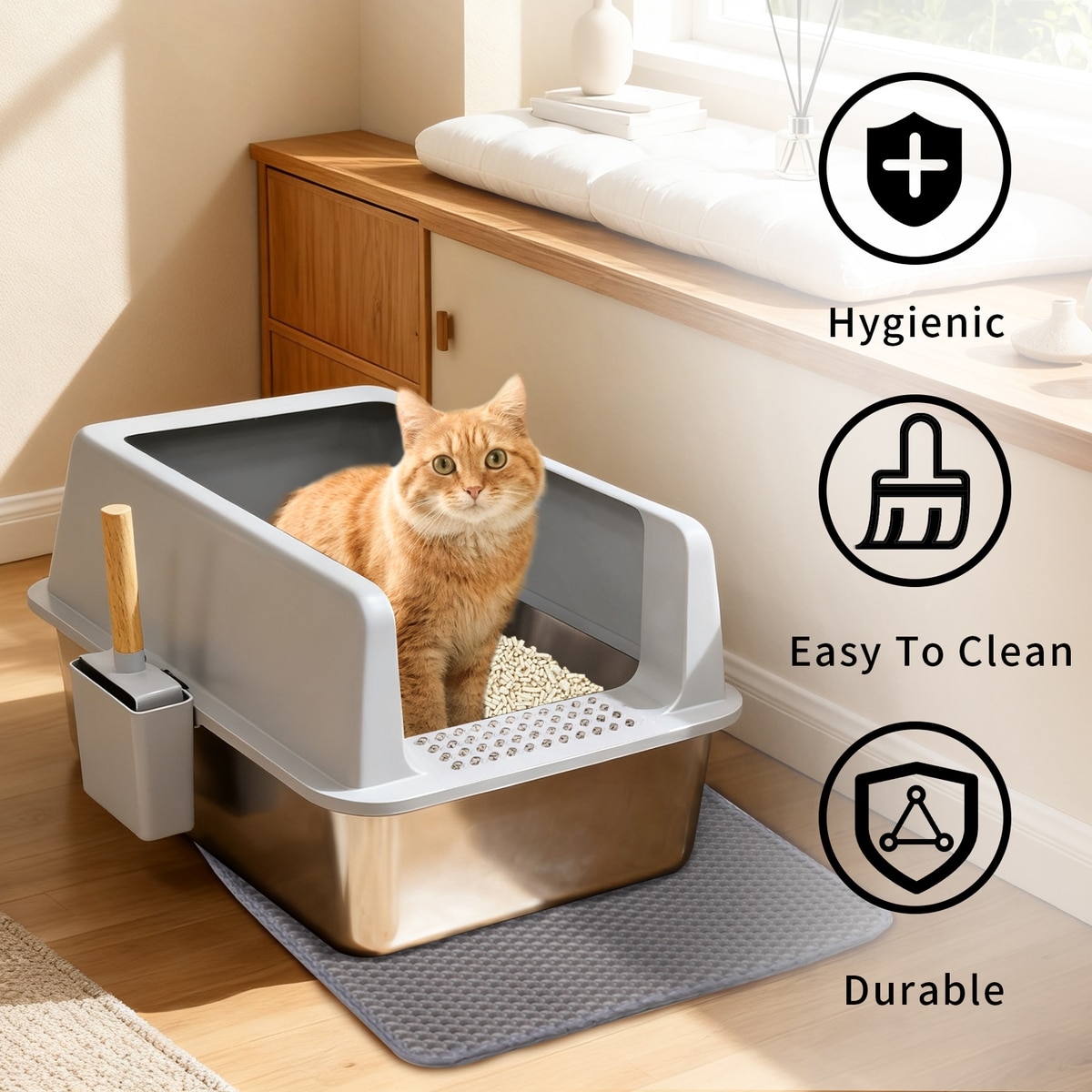 The 12” high walls contain litter and prevent splashes, while the front grid and included EVA mat capture stray particles from paws, reducing tracking and mess.