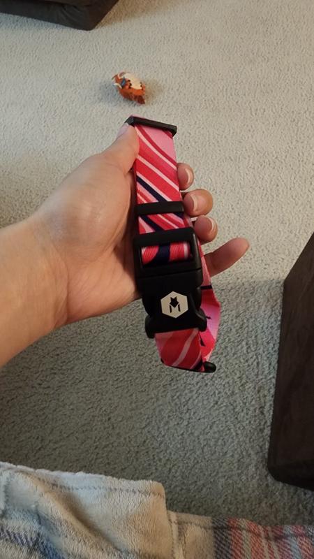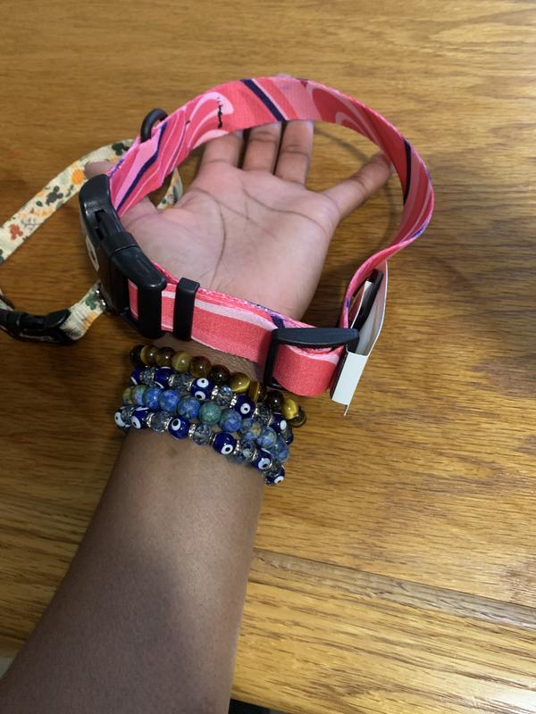I love this collar! It is very cute and the pattern is unique so it doesn’t look like every other collar. The material and the clip feel sturdy and, while I’m using
