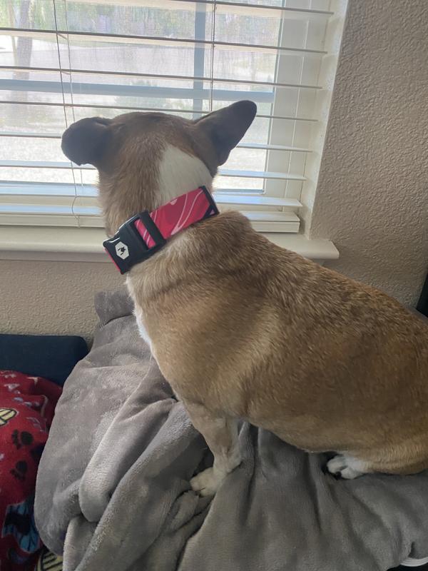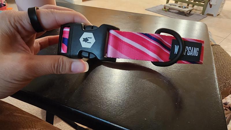 This high-quality collar is vibrant and looks great on my ACD. It adjusts size easily, and the closing mechanism is smooth, but secure. I like to put pink collars and other accessories on my dog, and this one is by far, the cutest collar I've put on her. I'd definitely repurchase in the future.