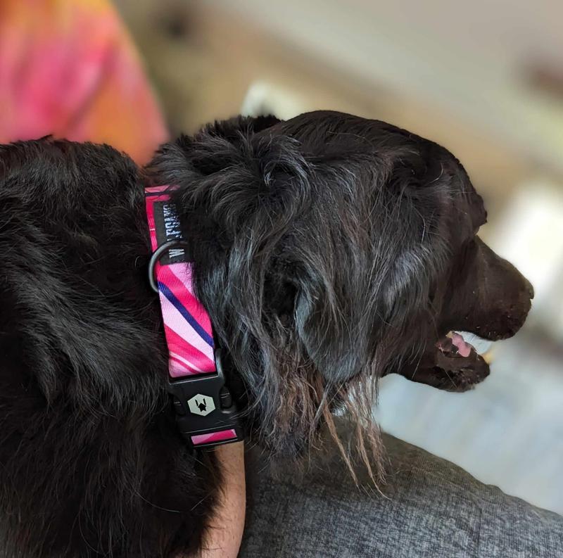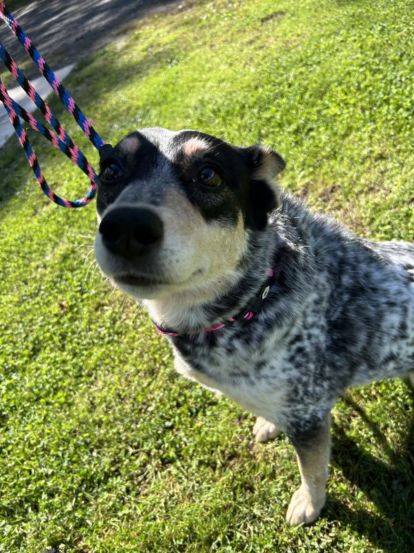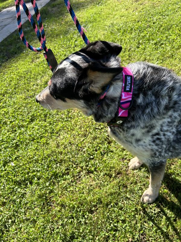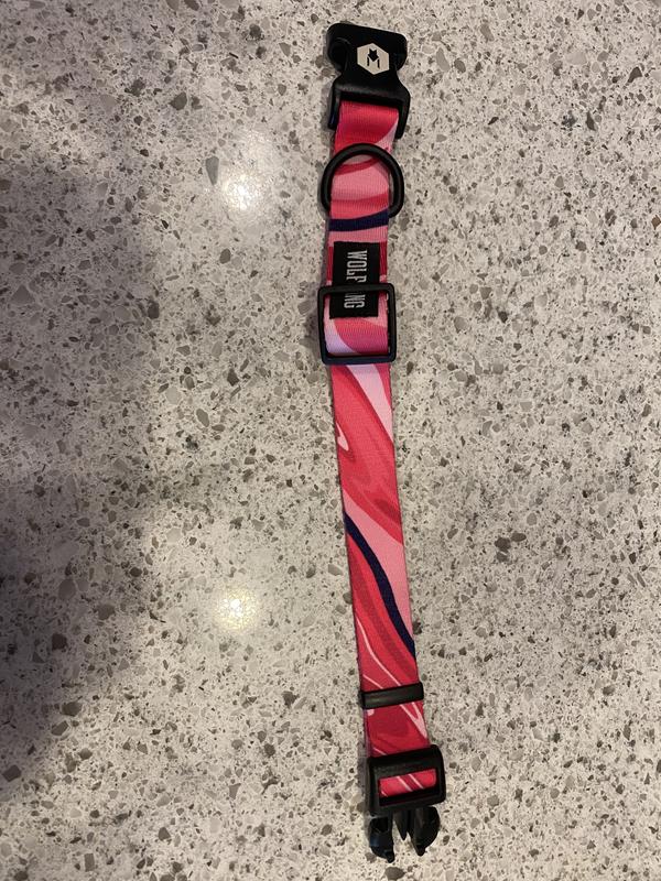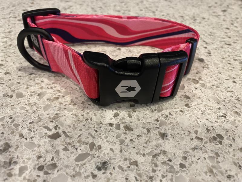 This high-quality collar is vibrant and looks great on my ACD. It adjusts size easily, and the closing mechanism is smooth, but secure. I like to put pink collars