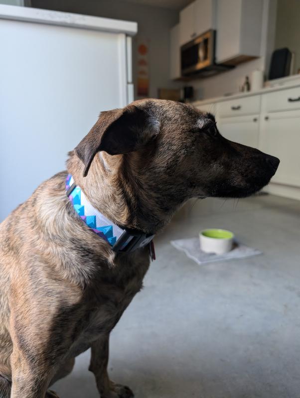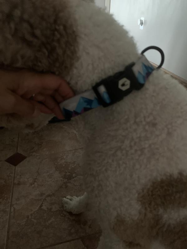This collar is great for our active dog! The material is sturdy and thick, which is good for dogs with extra, for lack of a better phrase, neck skin (our dog is a 30lb hound mix with lots of "lumps"). Love the pattern and that it has a little purple in it—enough that we just bought the matching harness!