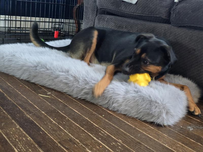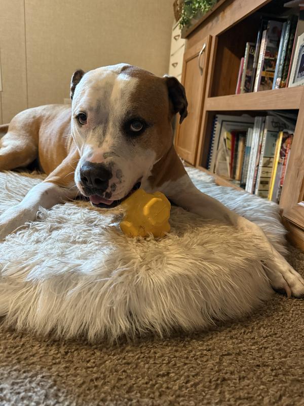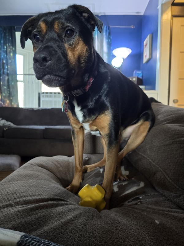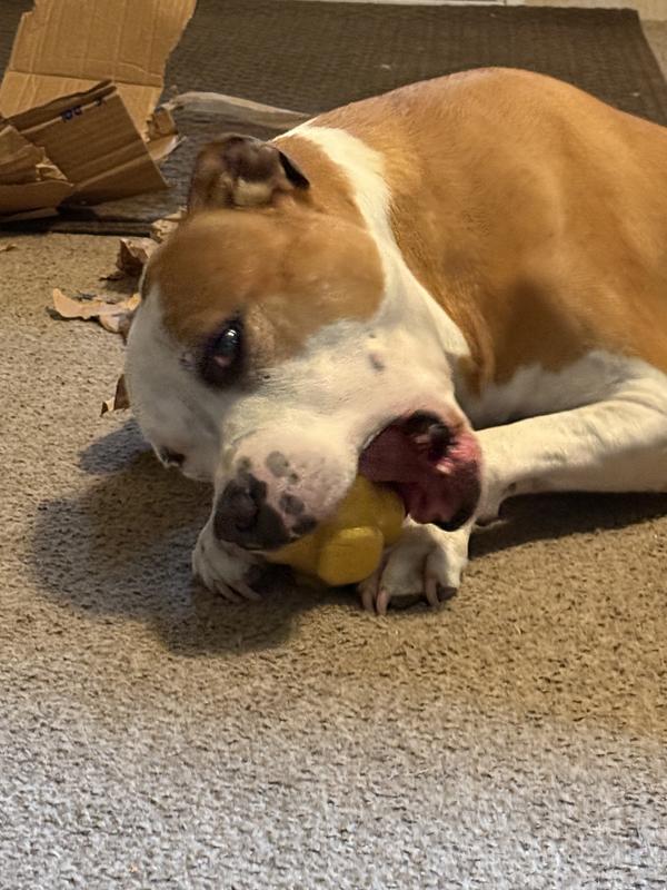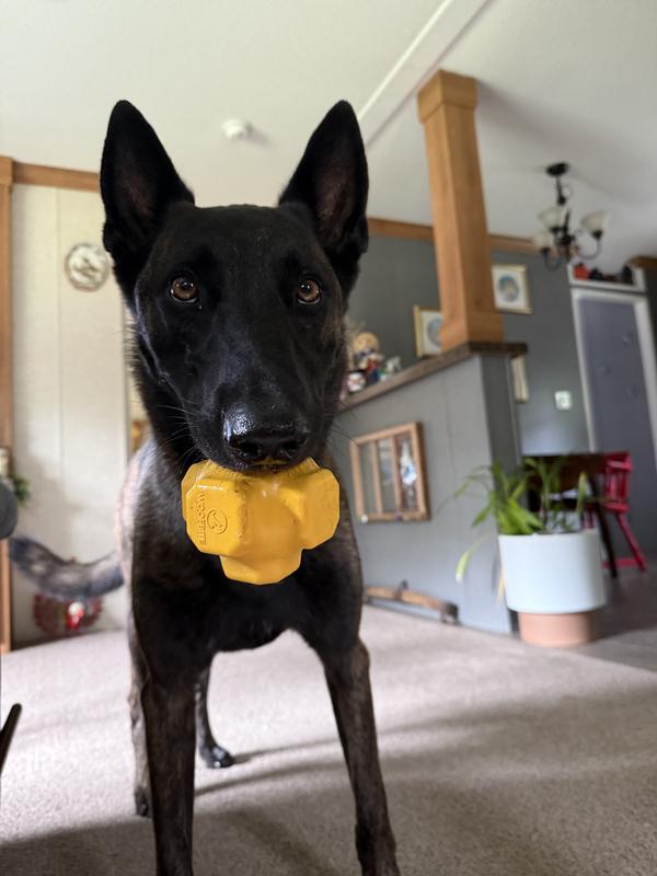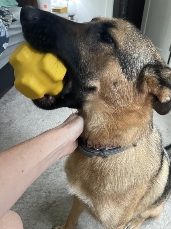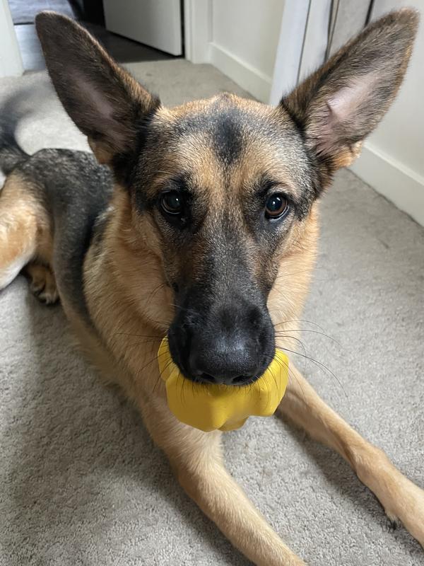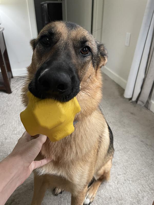 My 2yo GSP loves this “ball”. It has some weight to it, and for a pup who has destroyed Kong tennis balls, there’s no way he’ll be able to chew through this one. Because it’s abnormally shaped, playing fetch is hilarious because it’s not a simple retrieve until it stops moving. It bounces all over the place, which makes him get a little extra exercise tracking it down. Definitely a must have for dogs who like fetch, and are prone to destroying toys.