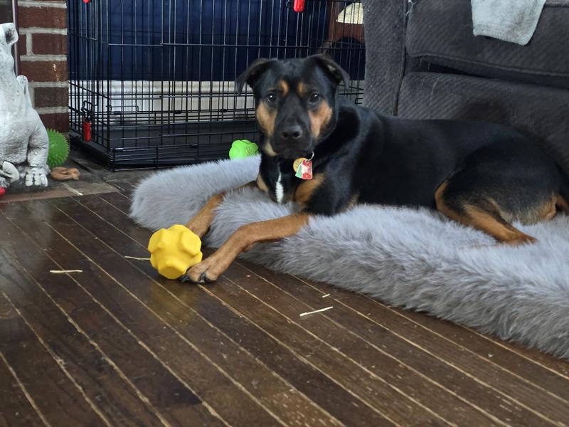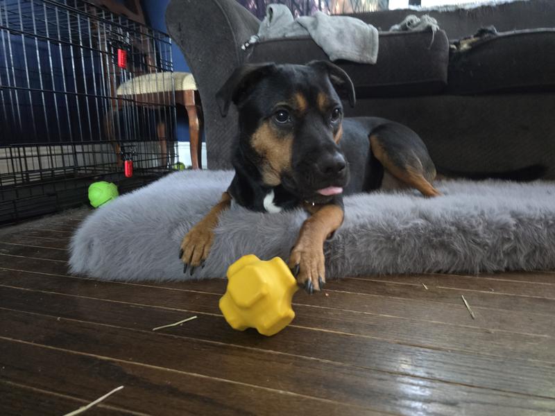 My 48-pound, three-year-old pittie/shepherd mix loves this jumping jack toy! The jack design allows it to bounce and wobble in different directions, keeping him