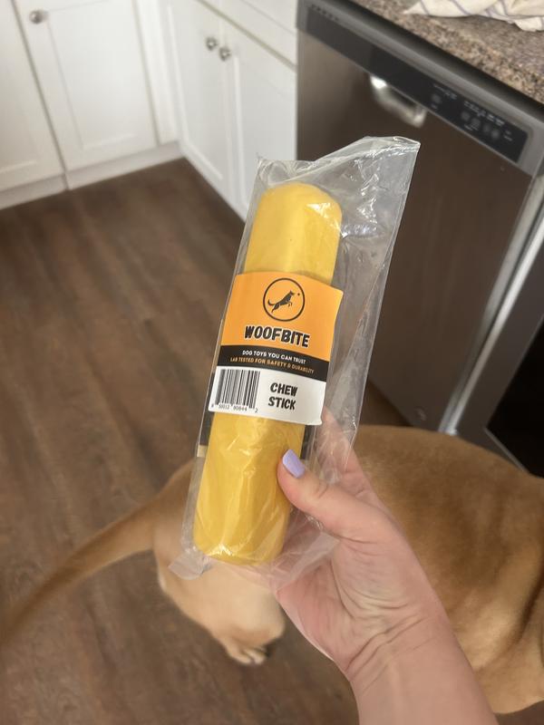 Two things I like about the WoofBite Power Stick are its bright yellow color and the fact that it bounces really well. The thing I dislike is how thick it is. For