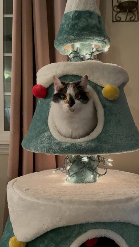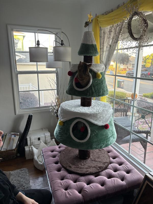 - Elevate your home decor and provide a cozy sanctuary for your kitties with this charming holiday cat tree.
