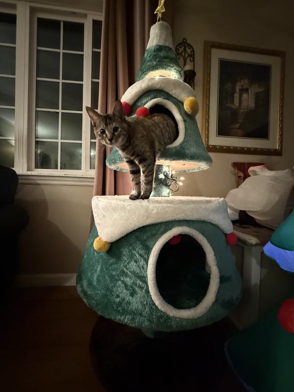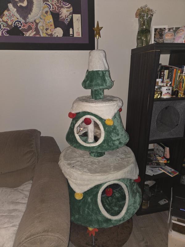 Got this cat tree so that I could have a Christmas tree that won't get knocked over by my 3 cats. It's very cute and soft, but very shaky and the top cat hide has the support beam right in front of the entrance. There's no way to move it because the fabric is stapled to the wooden base. Besides those two things, my cats seem to enjoy it so far!