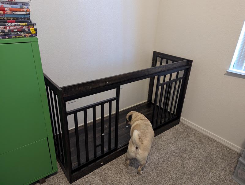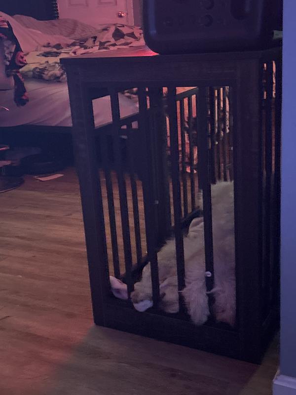 Great crate looks amazing in the space and easy to assemble. Door latches great and it is sturdy.