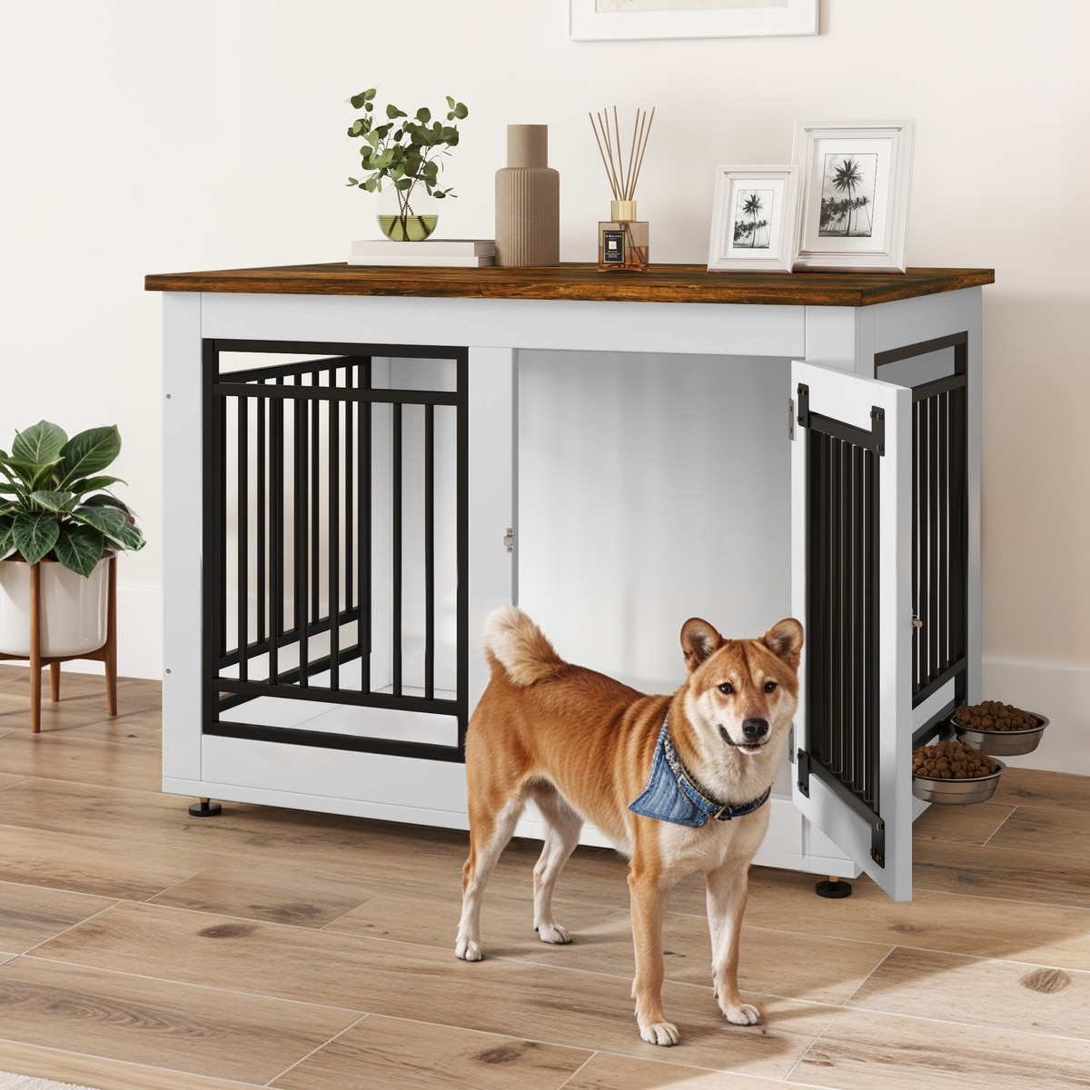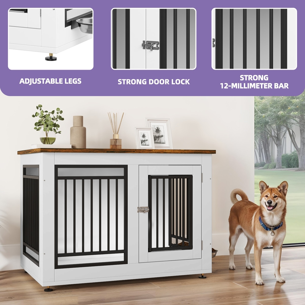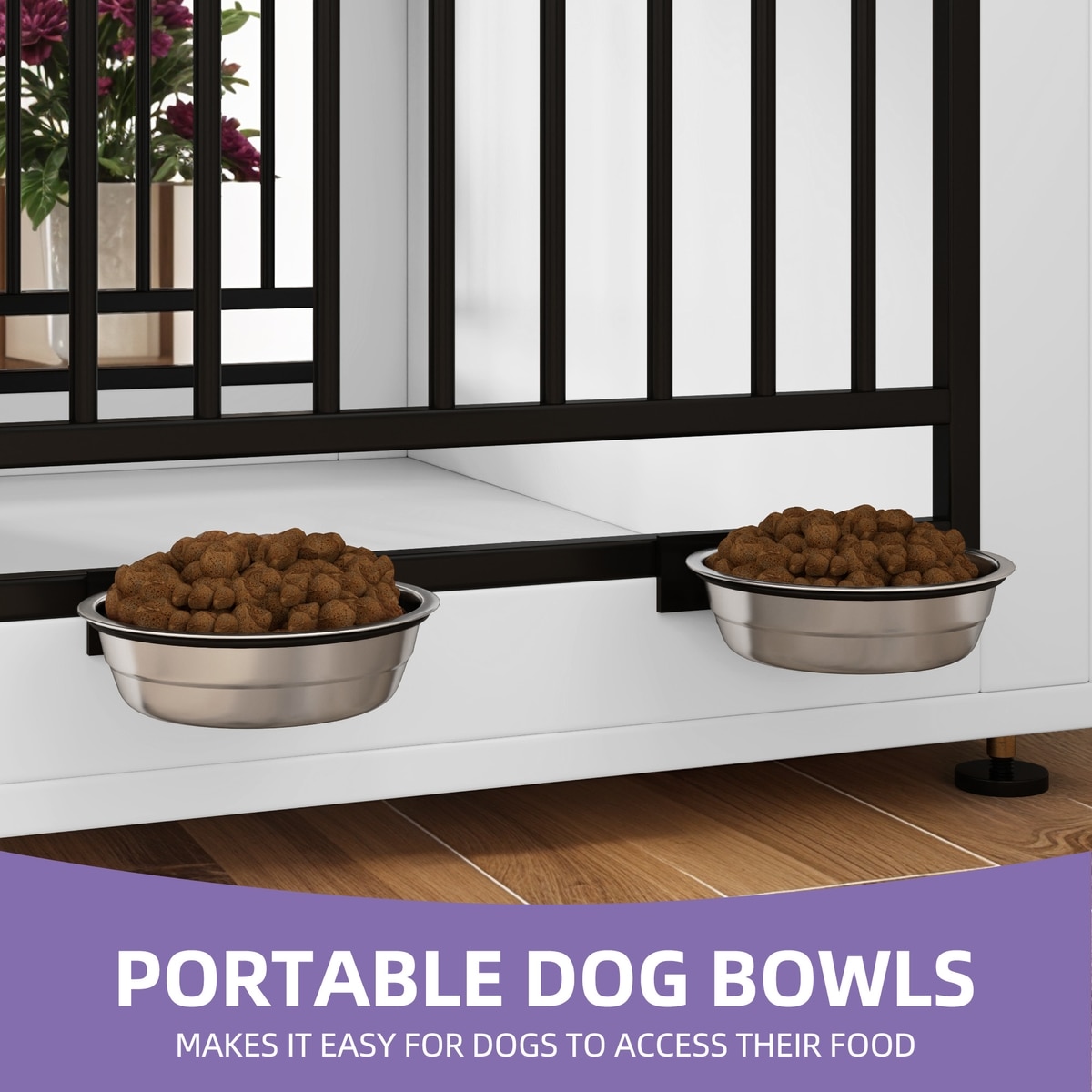 Wooflex Furniture Style Dog Crate with Adjustable Feet & Removable Bowls, White, 40 inch