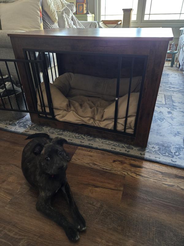 - This spacious dog crate doubles as a side table, providing a cozy retreat for your pet while also maximizing your space and personal style.