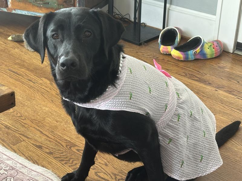 My girl is 60lbs. The XXL fits her perfectly. Light weight seersucker fabric, perfect for our beach days!