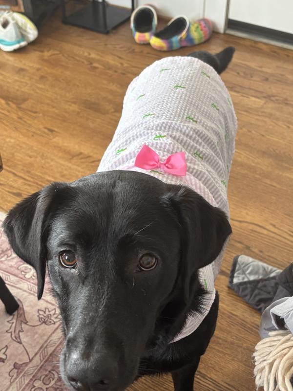 - Embroidered alligator graphic and coordinating bow add a touch of style.