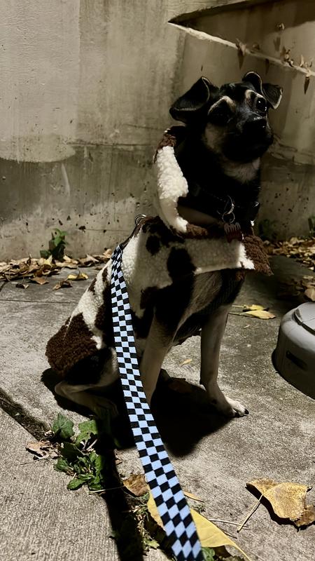 This is the cutest thing I’ve been so excited to get it, and I put it on my pup first thing! He’s the cutest little brown cow in the city. I wish the hood had a