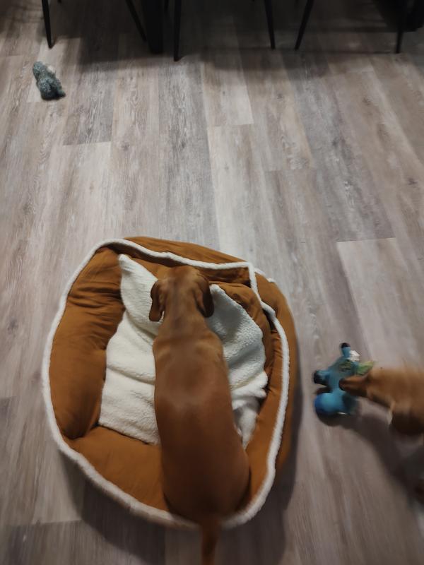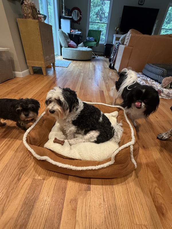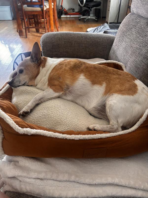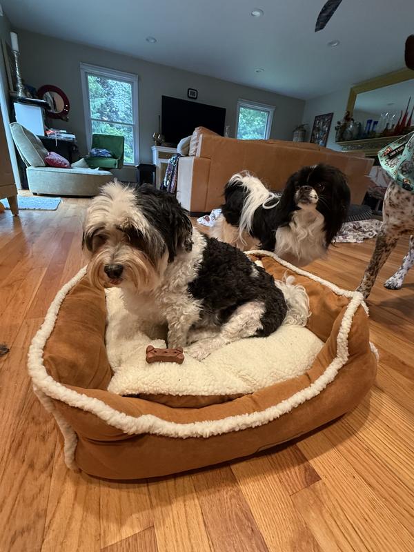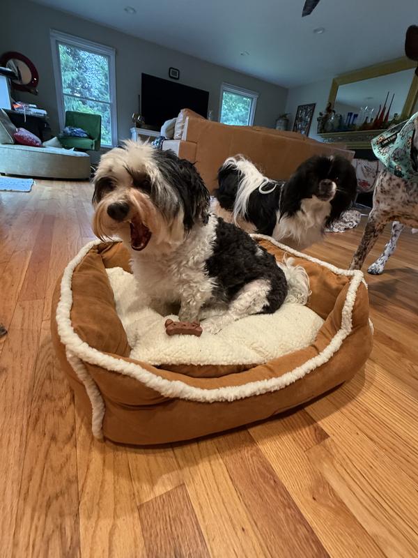 The Wrangler Sherpa Trimmed Cuddler is indeed something they cuddle up in with their favorite things. This bed is all things a dog bed should be, attractive, comfortable,