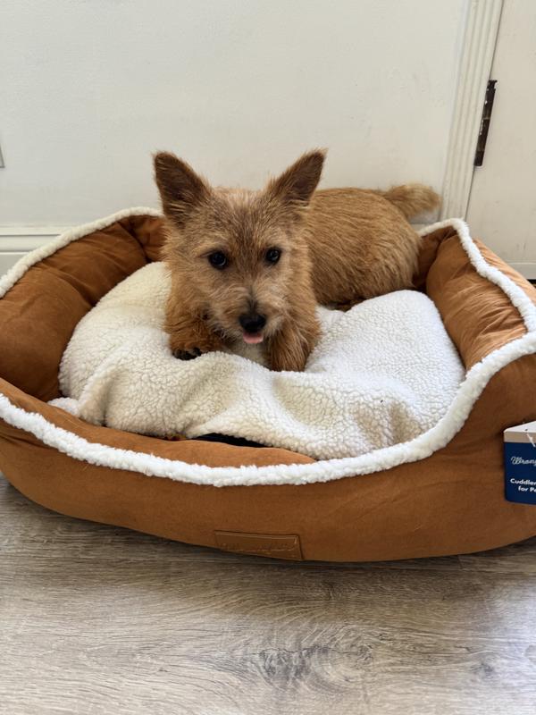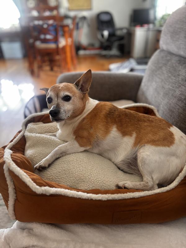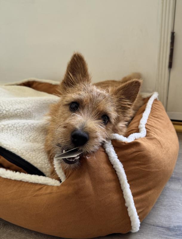 The Wrangler Sherpa Trimmed Cuddler is indeed something they cuddle up in with their favorite things. This bed is all things a dog bed should be, attractive, comfortable, washable (machine wash, dry flat) and made of quality fabrics with zip cover over the mattress section.