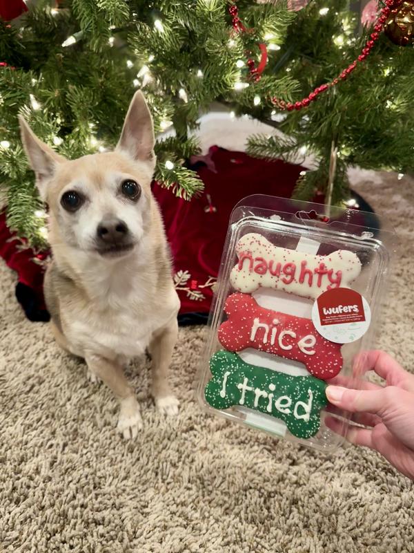 Wufers Naughty, Nice, I Tried! Christmas Bones Cinnamon, Apple & Honey Cookie Dog Treats, 2.6-oz box, 3 count
