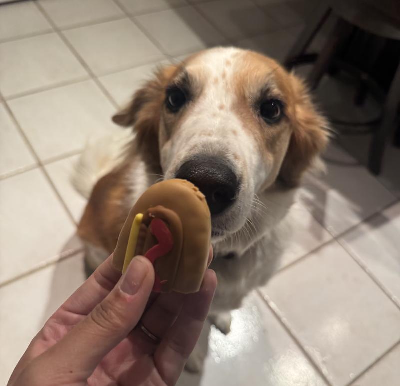 I never know what pet treat my finicky Ahsoka the Bernedoodle will accept from day to day, when I want to reward her for good behavior. This was a total hit, as you can see from the pics! She even did her turn trick for it! The total adorableness of the cute cookies are SO fun! That makes it a great gift for dog families, too. We chose the hot dog, and fries shaped cookies for today’s trial. And at $7 & change for two extra large cookies, you can’t go wrong! Puppers are kept happy and occupied and better trained for their cookie treats! Check it out when you are looking for something fun for your beloved companion pet. All the stars from Dogfluencer, Ahsoka!