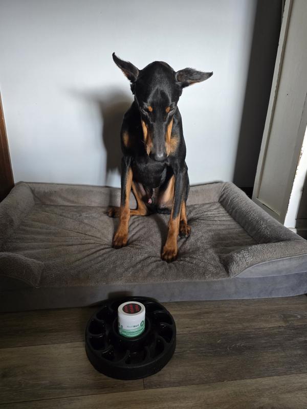 I started my doberman, Kane, on Wuffwell collegen roughly 2 wks ago. He loves it! The product is easily sprinkled to the top of his food. I like that it does not