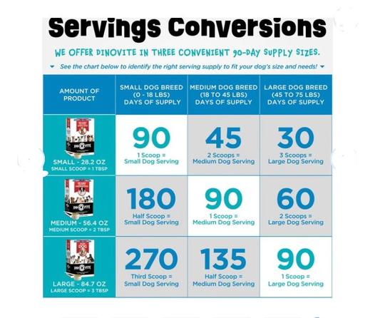 Each breed size of this supplement contains the same ingredients. The manufacturer has packaged them differently so that each breed size contains a 90 day supply for each daily dose needed. Dinovite for dogs is a whole food supplement. This nutrition is great addition to the routine in helping to support a pet's immune function, digestive tract, skin, coat, and many other function of the body.