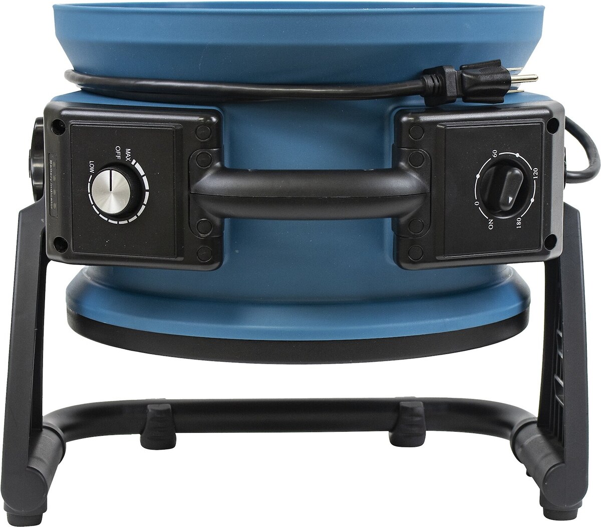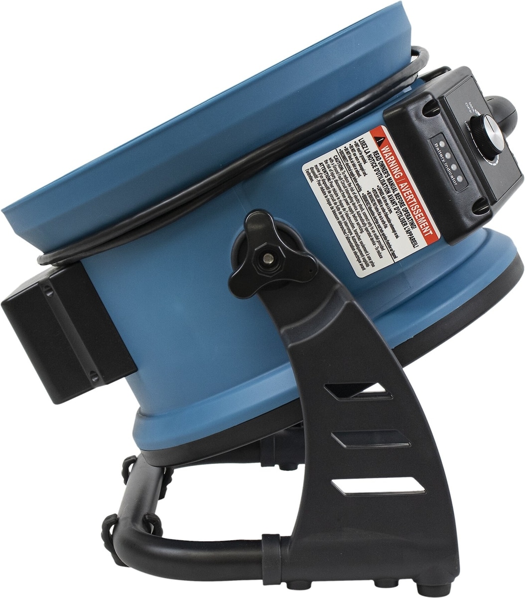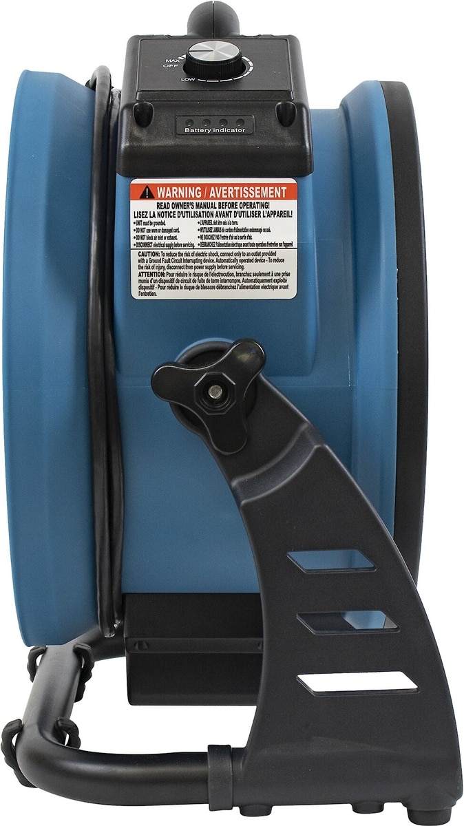 The fan measures 16.10 x 14.20 x 8.90 inches (Length x Width x Height) and weighs 9.9 pounds. This fan features a built-in rechargeable battery (115V / 60 Hz) with an LED battery life indicator bar. Battery run times will vary: estimated 3 hours at full speed and 24+hrs at low speed. The charging cord has a length of 6 feet.