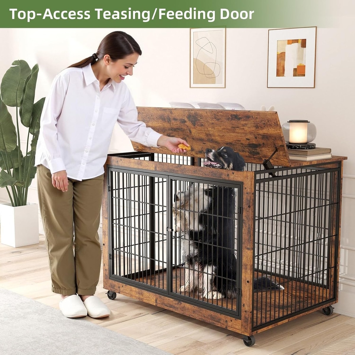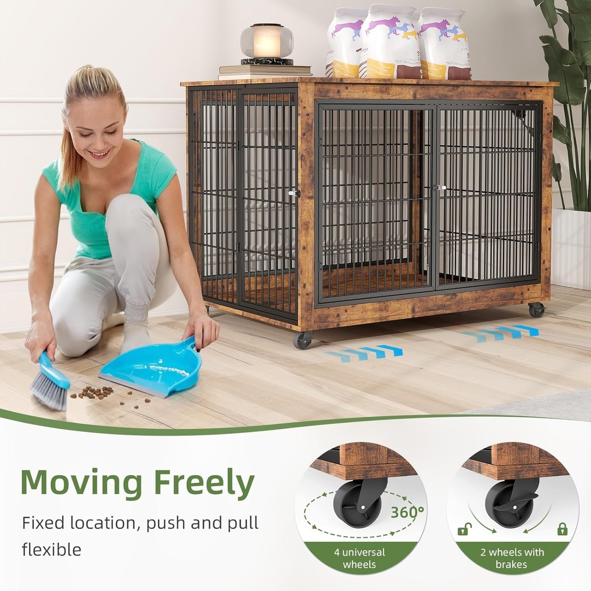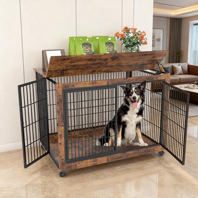 Yafylly Wooden Furniture Style End Table Double Door Dog Crate with Wheels, X-Large, Rustic Brown