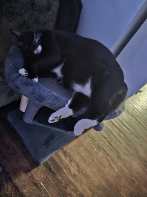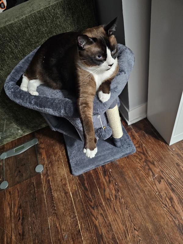 The particle wood platforms and support posts provide steady surfaces for your cat to climb up and down freely. An included safety strap lets you secure the cat tree to the wall, to help prevent damage and injury from tips during intensive jumping and play.