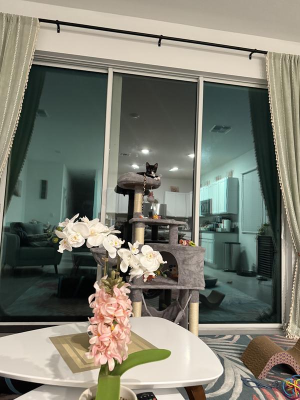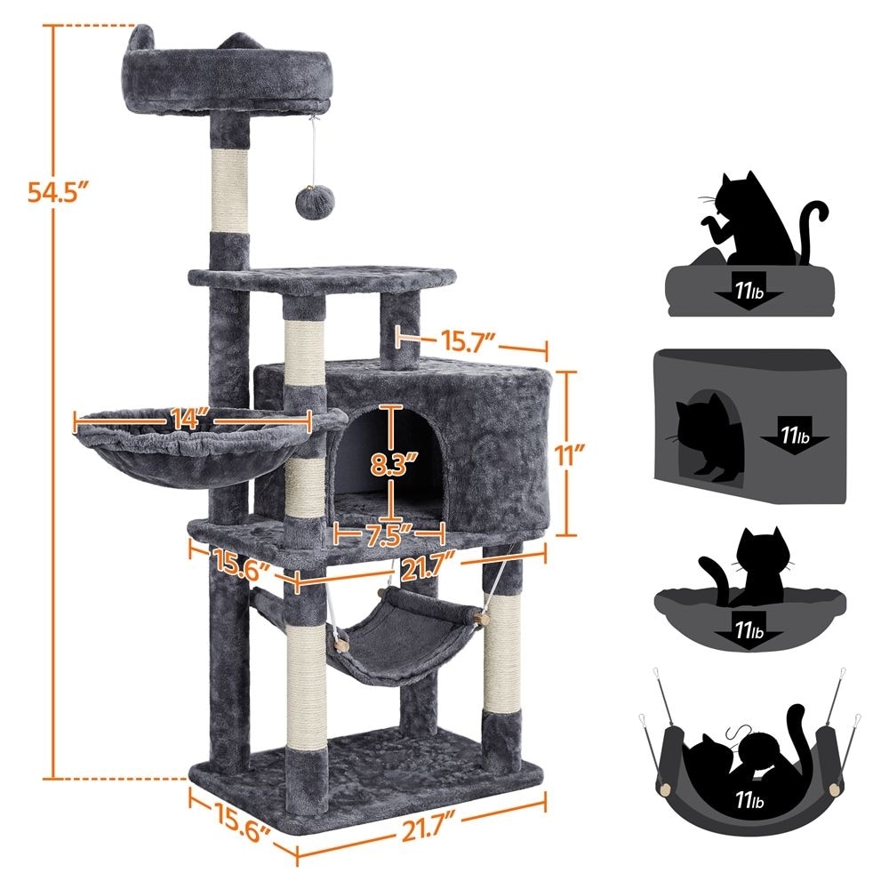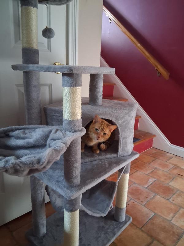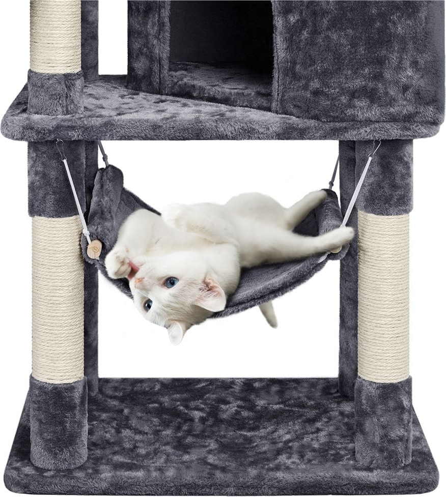 The particle wood platforms and support posts provide steady surfaces for your cat to climb up and down freely. An included safety strap lets you secure the cat tree to the wall, to help prevent damage and injury from tips during intensive jumping and play.