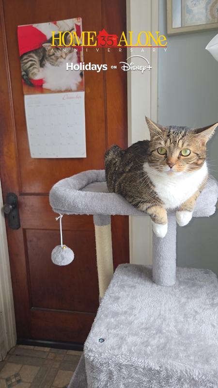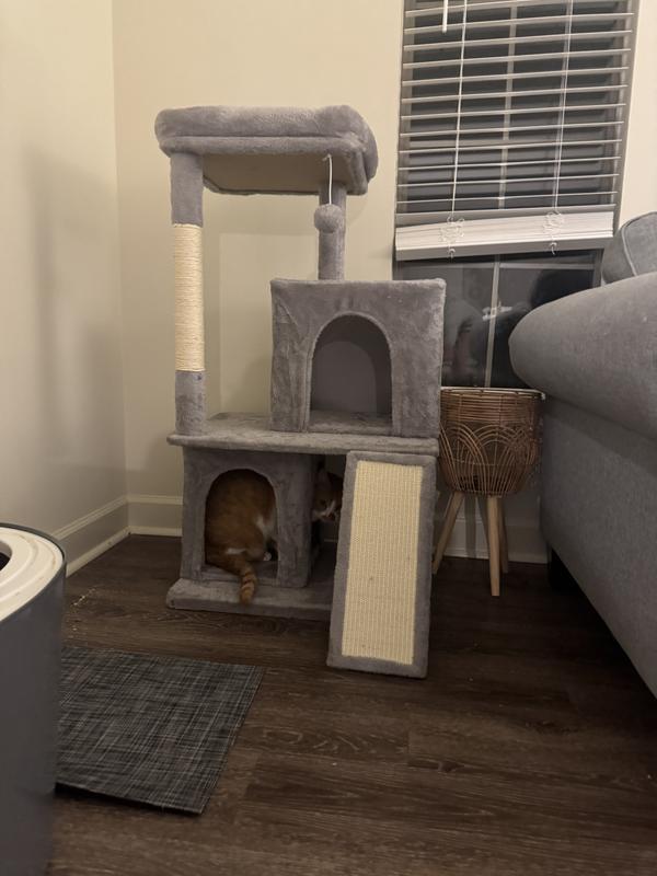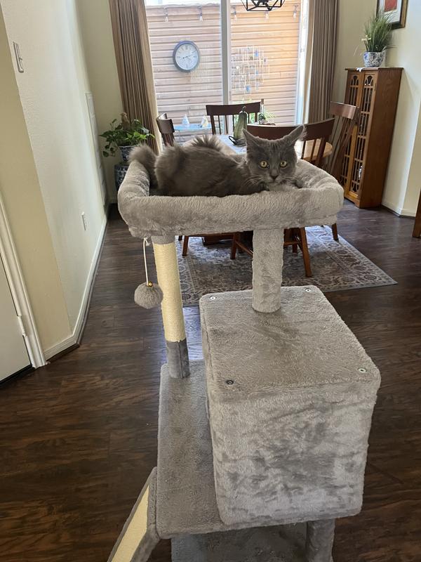 The particle wood platforms and support posts provide steady surfaces for your cat to climb up and down freely. An included safety strap lets you secure the cat tree to the wall, to help prevent damage and injury from tips during intensive jumping and play.
