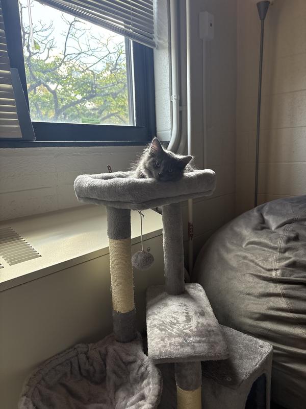 The particle wood platforms and support posts provide steady surfaces for your cat to climb up and down freely. An included safety strap lets you secure the cat tree to the wall, to help prevent damage and injury from tips during intensive jumping and play.