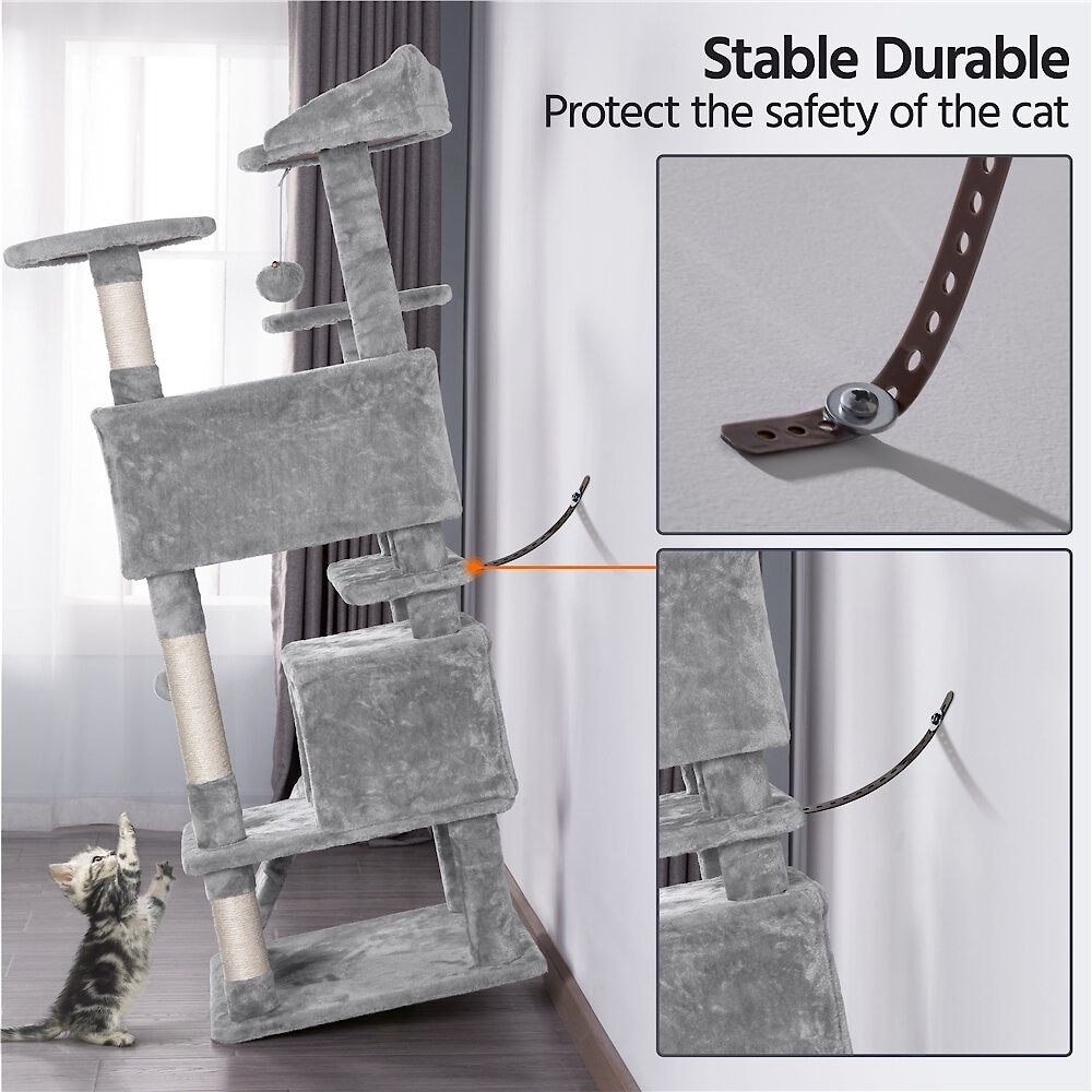 The particle wood platforms and support posts provide steady surfaces for your cat to climb up and down freely. An included safety strap lets you secure the cat tree to the wall, to help prevent damage and injury from tips during intensive jumping and play.